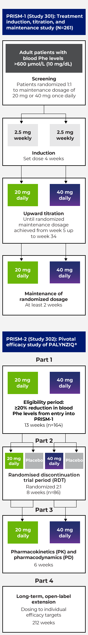 20 mg or40 mg once daily) or receive matching placebo4 - Entry into the RDT was determined by whether patients achieved a ≥20% reduction in blood Phe levels from pretreatment baseline, following a period of up to 13 weeks of additional treatment with PALYNZIQ®4